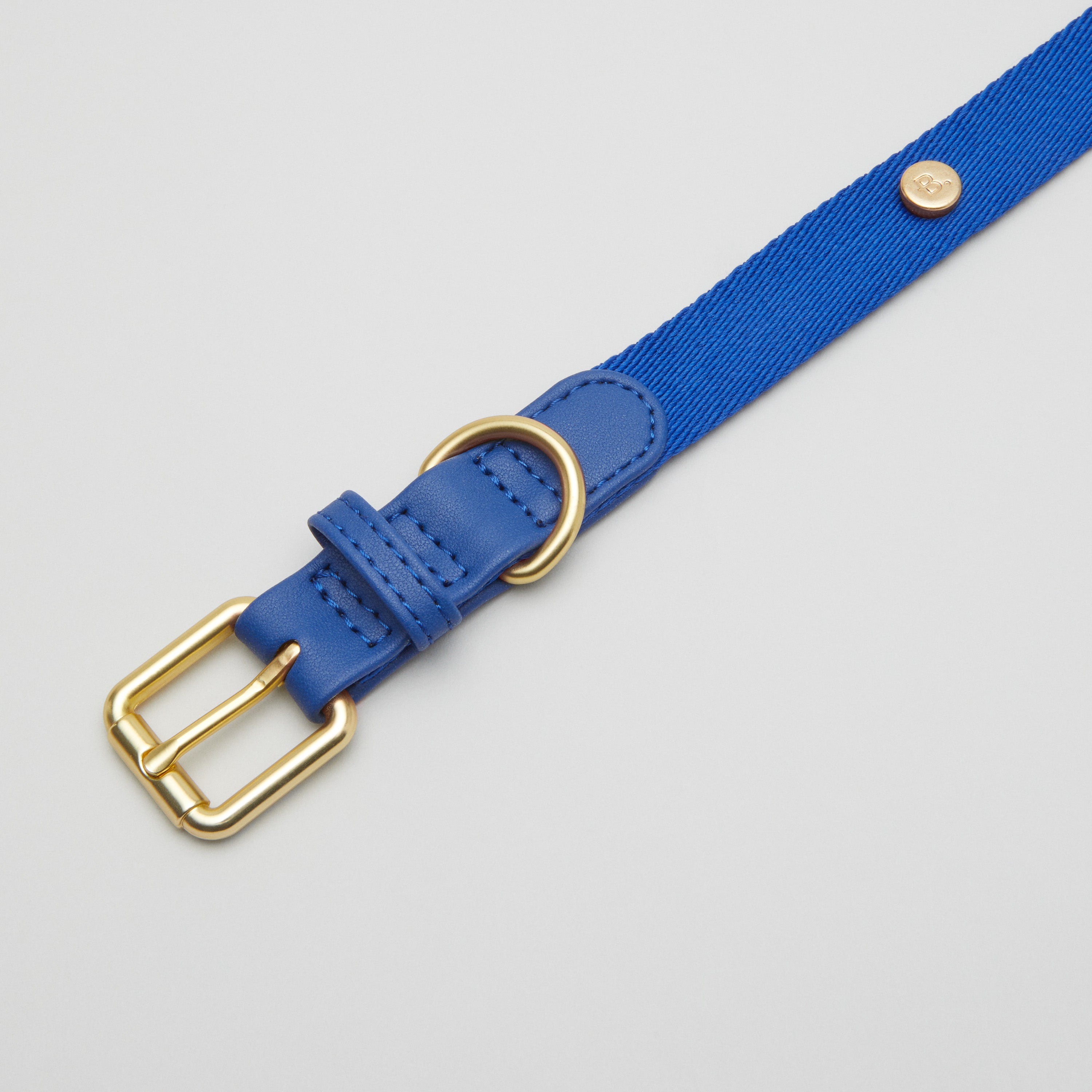 Looking for a stylish, vegan-friendly collar and leash set for your pup? Look no further! This chic bule collar and leash set includes a dog collar crafted from vegan leather and webbing made from recycled plastic bottles. The matching dog leash is also made from vegan leather and recycled polyester for a sustainable option that will stand up to daily walks and adventures. Plus, the hardware is finished in matte gold for a modern touch. Whether you're taking your furry friend on a leisurely stroll around the block or hitting the trails for an energetic hike, we got you covered.