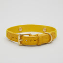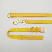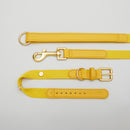 Looking for a stylish, vegan-friendly collar and leash set for your pup? Look no further! This chic yellow collar and leash set includes a dog collar crafted from vegan leather and webbing made from recycled plastic bottles. The matching dog leash is also made from vegan leather and recycled polyester for a sustainable option that will stand up to daily walks and adventures. Plus, the hardware is finished in matte gold for a modern touch. Whether you're taking your furry friend on a leisurely stroll around the block or hitting the trails for an energetic hike, we got you covered.
