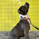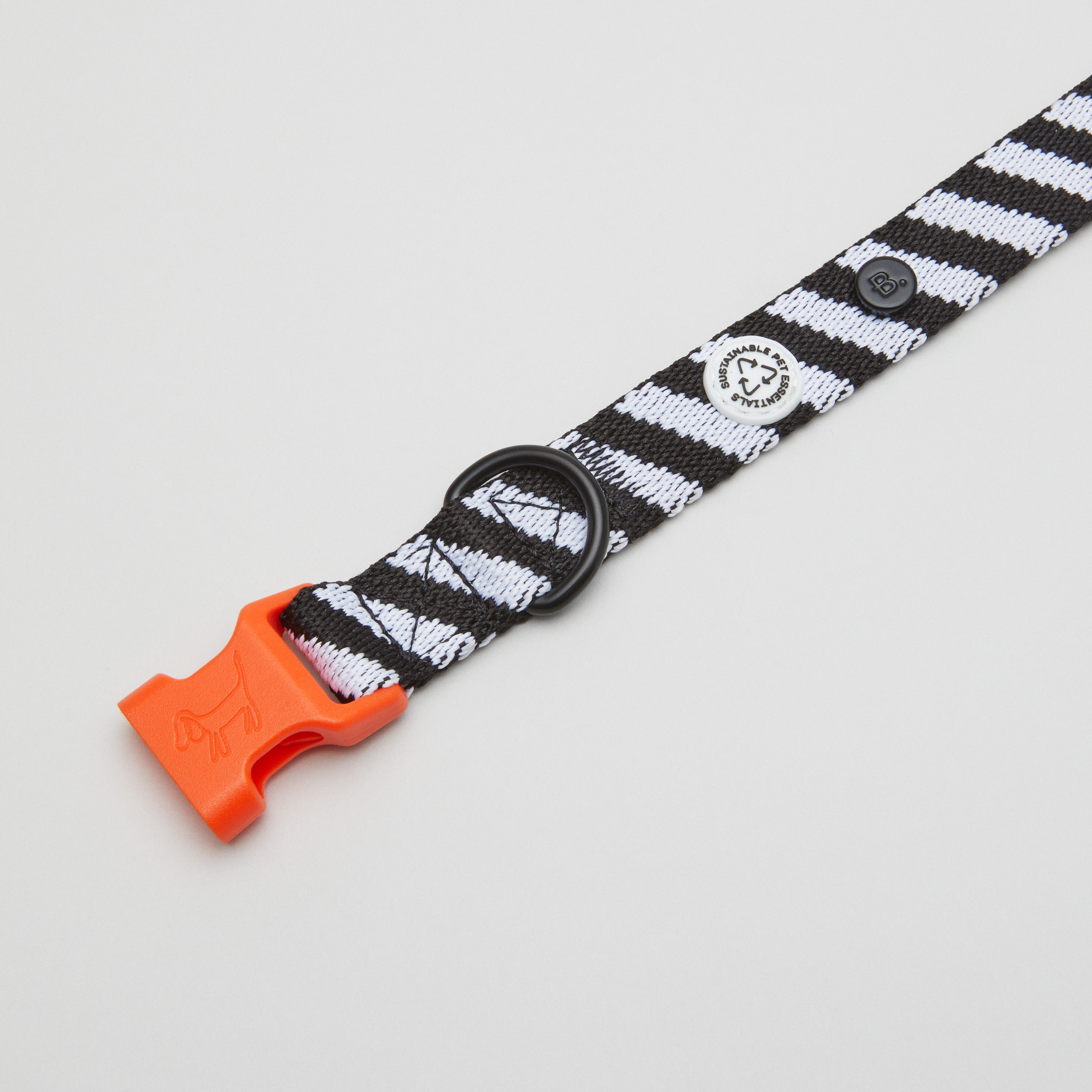 Our dog collar with the classic black and white stripes is made in Europe from recycled polyester. The collar is easily adjustable to fit your dog perfectly and the orange quick release buckle is the perfect splash of color.